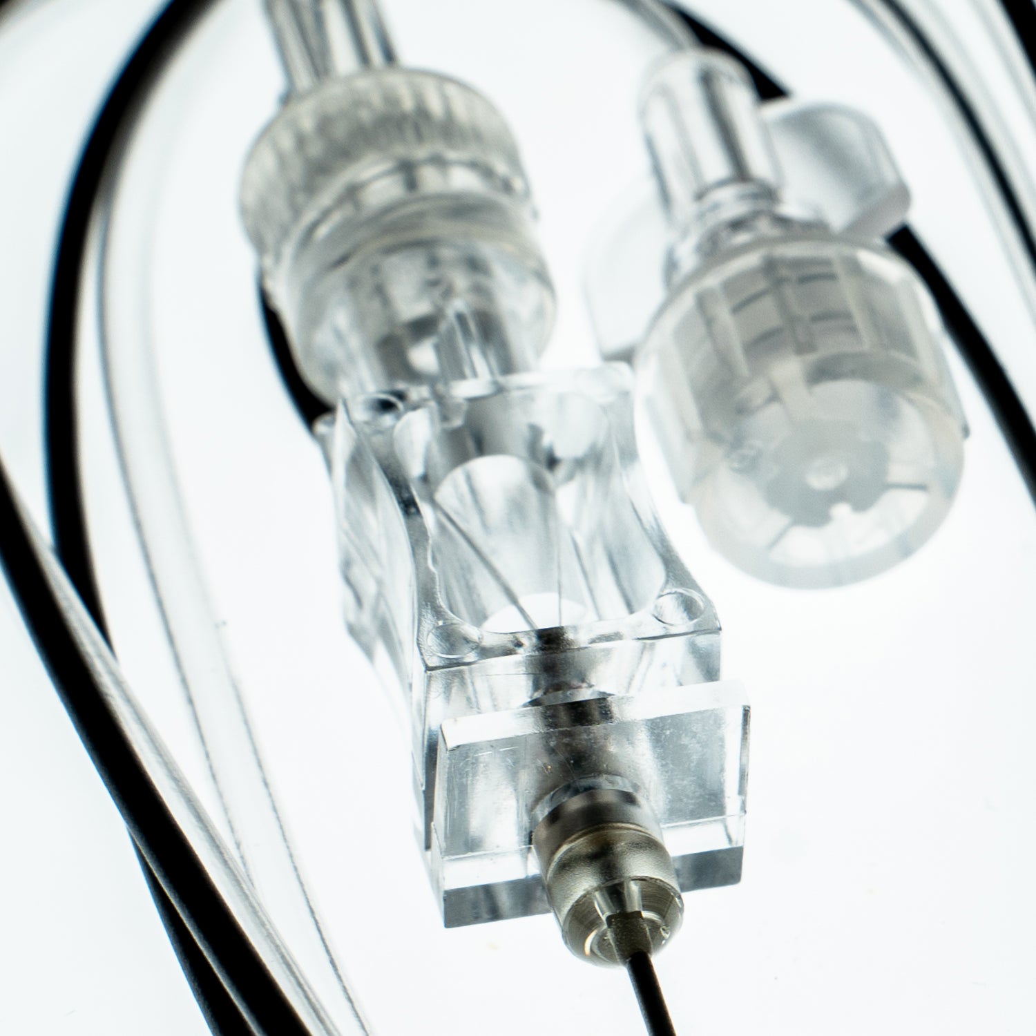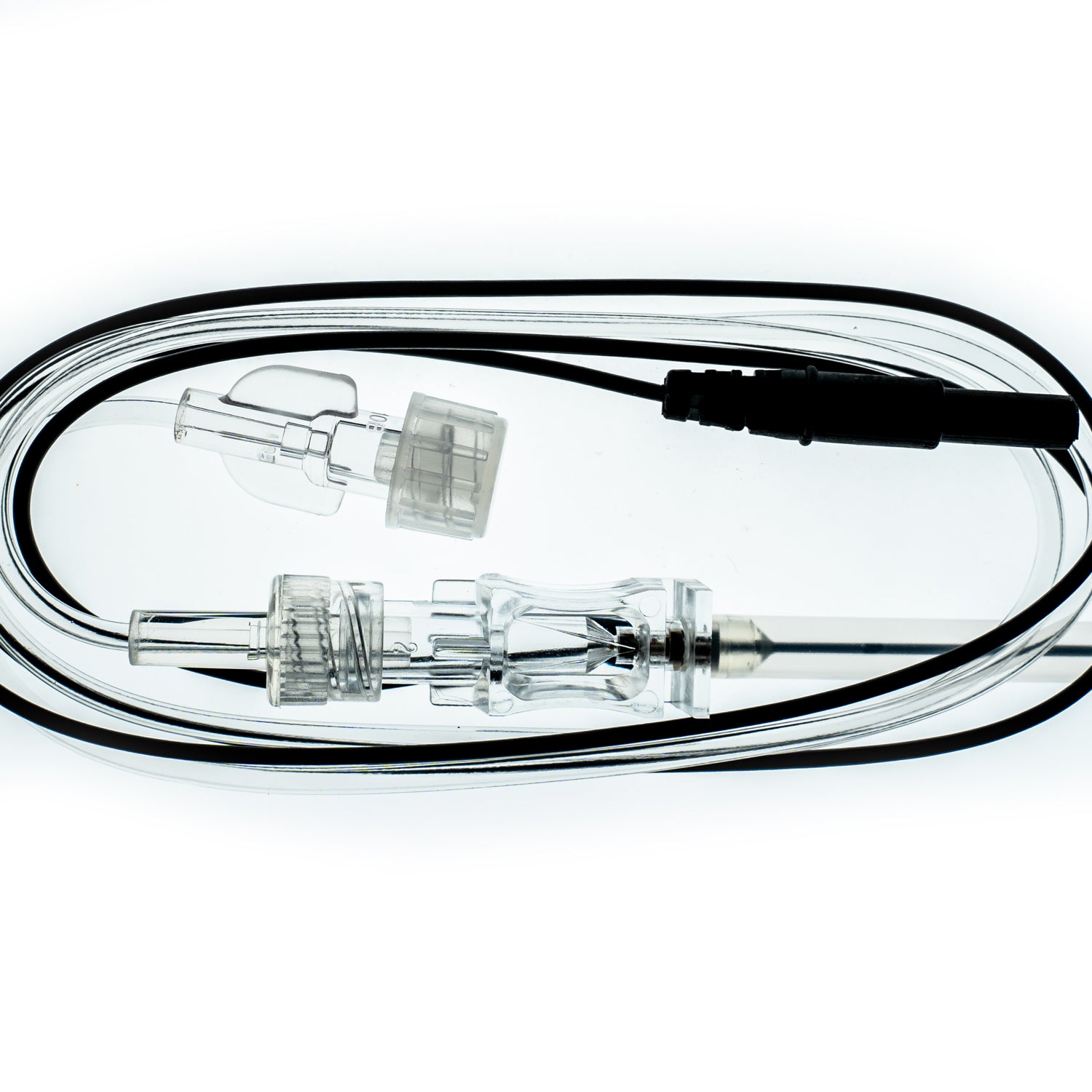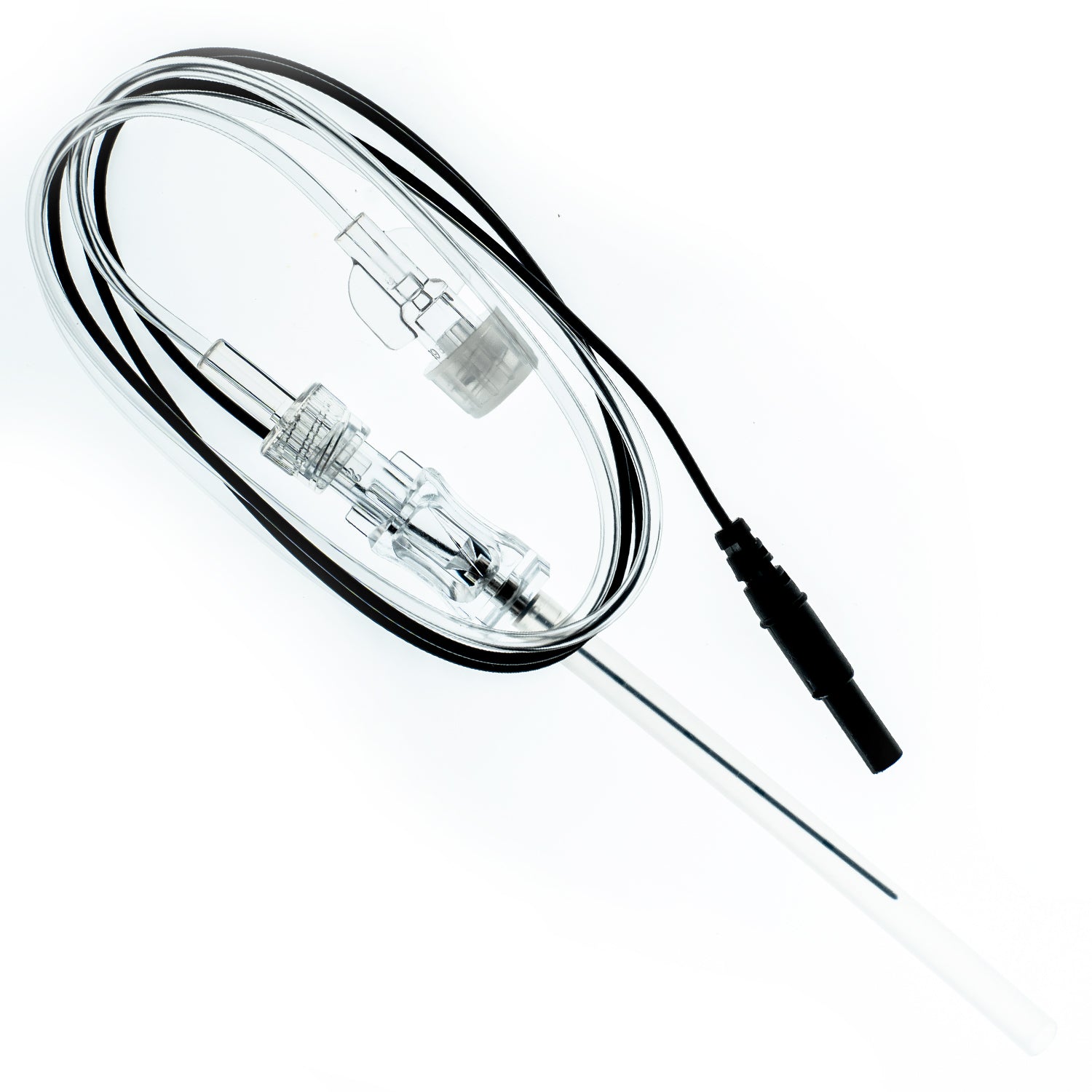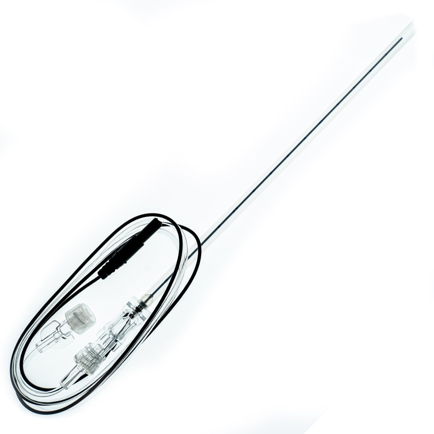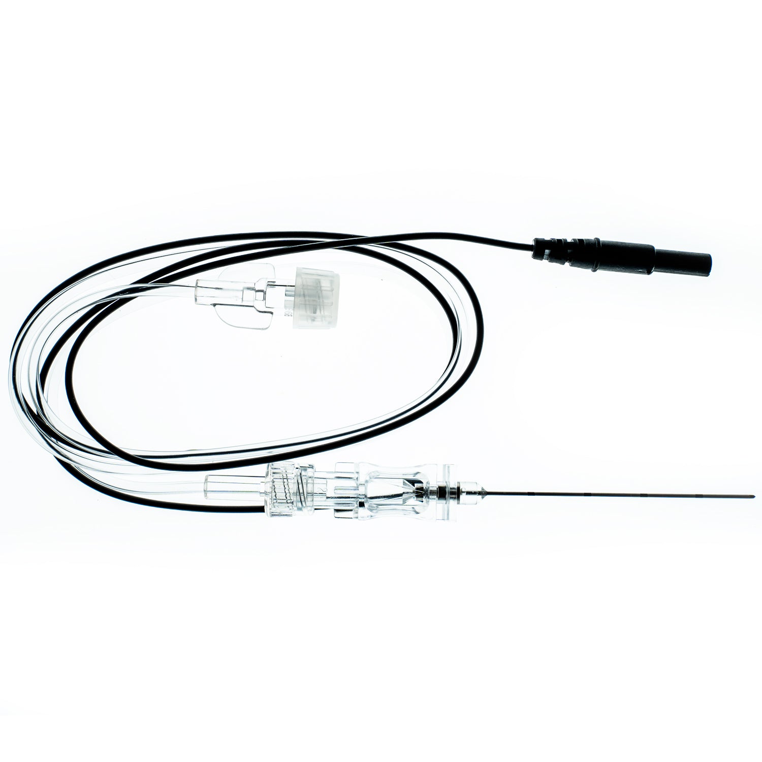 Aguja Echoplex que puede ser utilizada con Electro neuroestimulación o ultrasonido. Aguja ecogénica hasta la punta con bisel de 20° con recubrimiento de múltiples microesferas de vidrio en toda su longitud, solo la punta del bisel es conductiva. Cable eléctrico de 60cm de longitud, conductor hembra y un tubo de extensión transparente removible de 50cm de largo, longitud de la aguja 50 mm y diámetro de 22g.