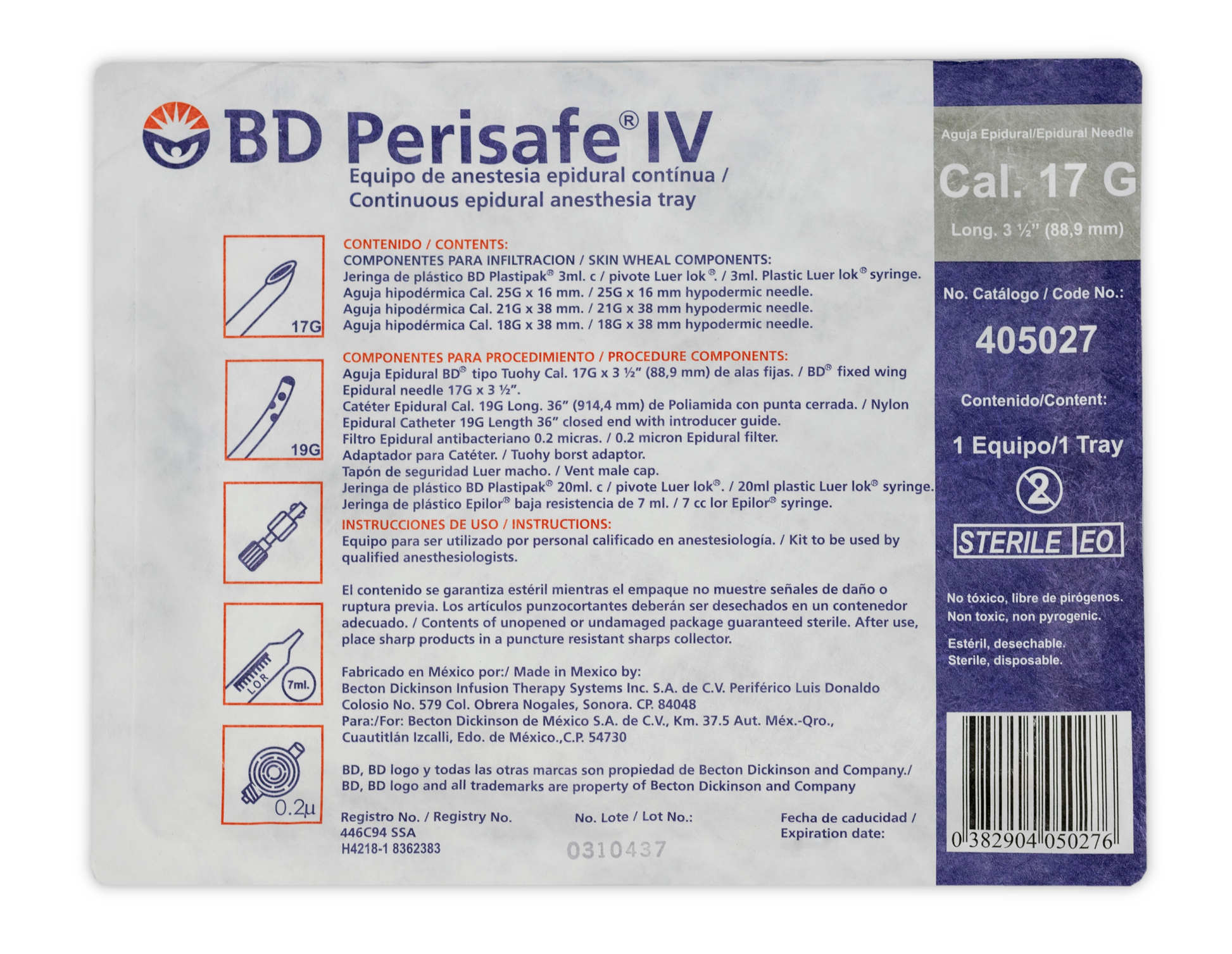 Equipo con los componentes necesarios para la administración de anestesia epidural continua. Producto estéril por óxido de etileno, desechable y para un solo uso Registro Sanitario 0446C94 SSA.